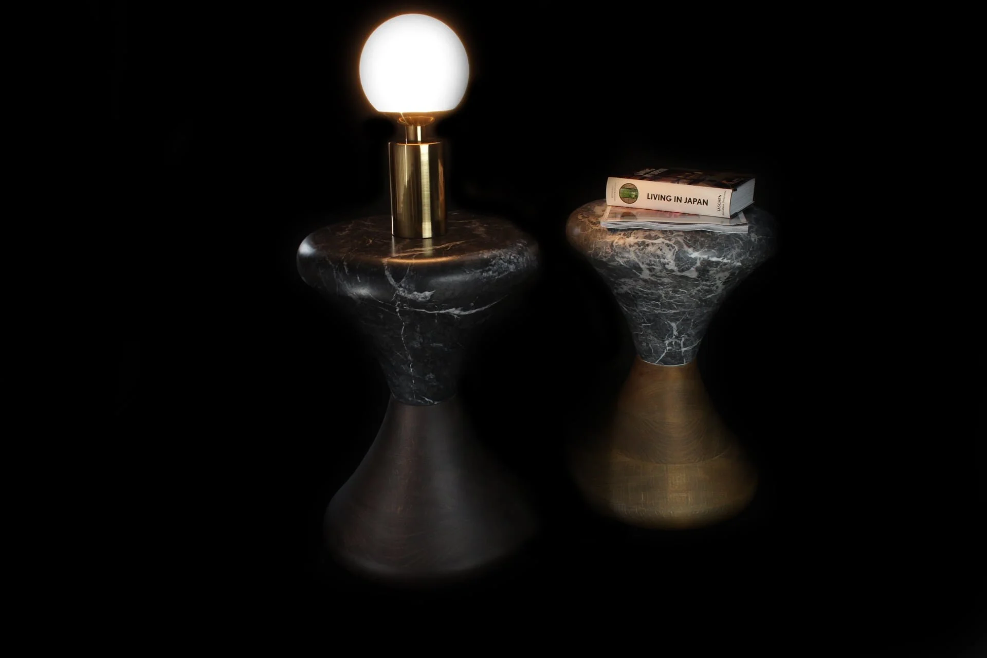 La table d’appoint IAN symbolise un sablier, représentant le temps qui passe. Son design permet de l’utiliser comme une table d’appoint ou un tabouret. Le jeu des matières - marbre et bois - invite l’utilisateur à choisir la façon dont le meuble sera exposé et changer la disposition selon sa volonté.